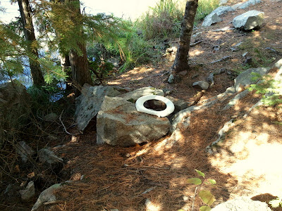 toilet seat atop some large rocks.